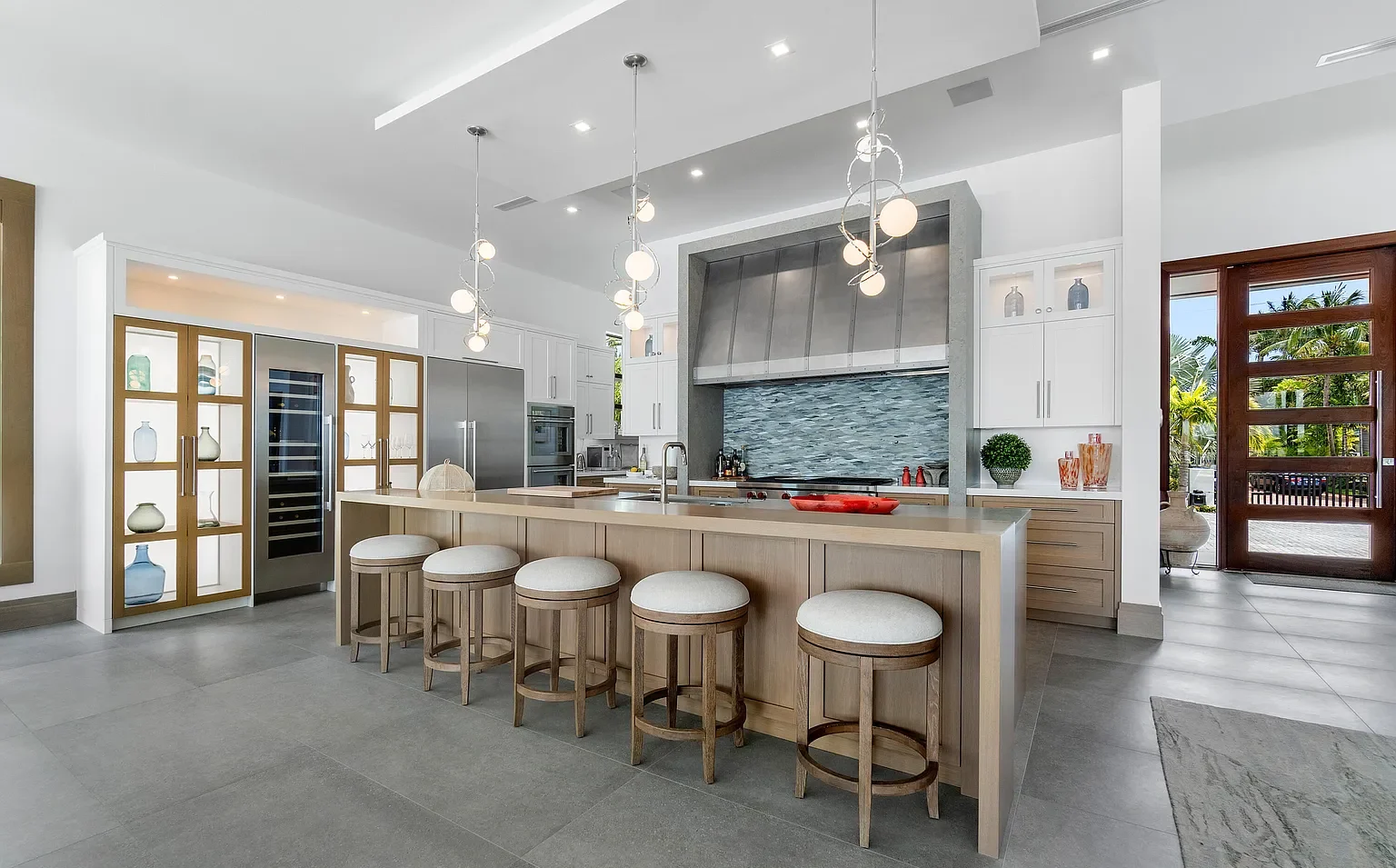 Light-toned cabinetry, expansive countertops, and integrated appliances reinforce the open, airy feel of the space.